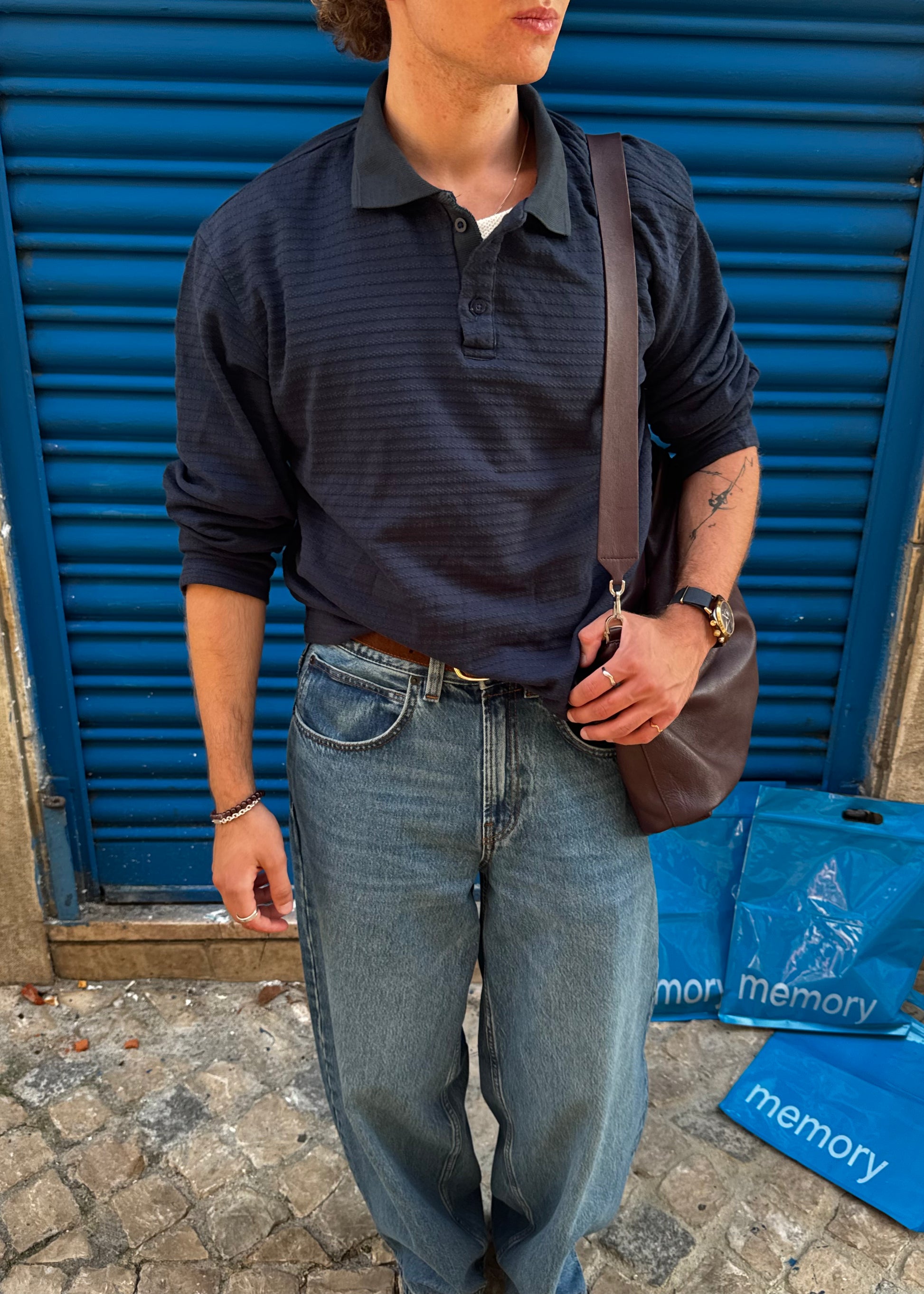 The navy long-sleeve polo blends structure and comfort with subtle horizontal texturing that adds depth without distraction. Comes with 2 different patterns, yes its reversible!